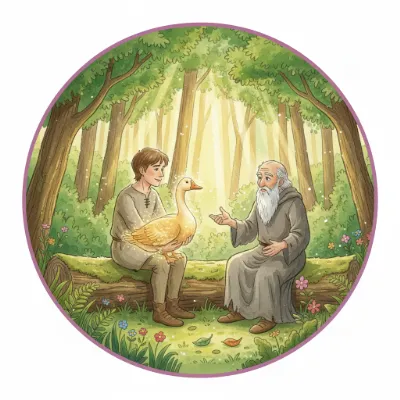 心優しい若者が、森の中で一人のおじいさんに食べ物を分け与えました。