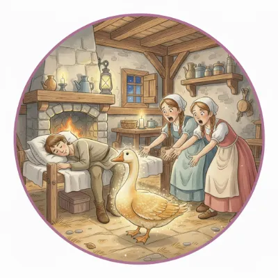 When the young man stayed at an inn, three sisters tried to steal a feather.