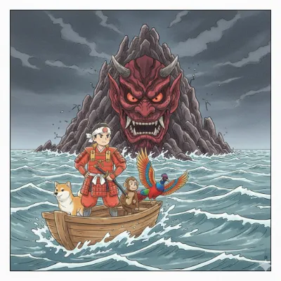 彼らは海を渡り、恐ろしい鬼ヶ島に到着しました。